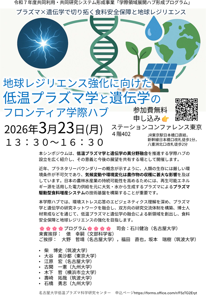 本シンポジウムは、 低温プラズマ学と遺伝学の異分野融合を推進する学際ハブの設立を広く紹介し、その意義と今後の展望を共有する場として開催します。